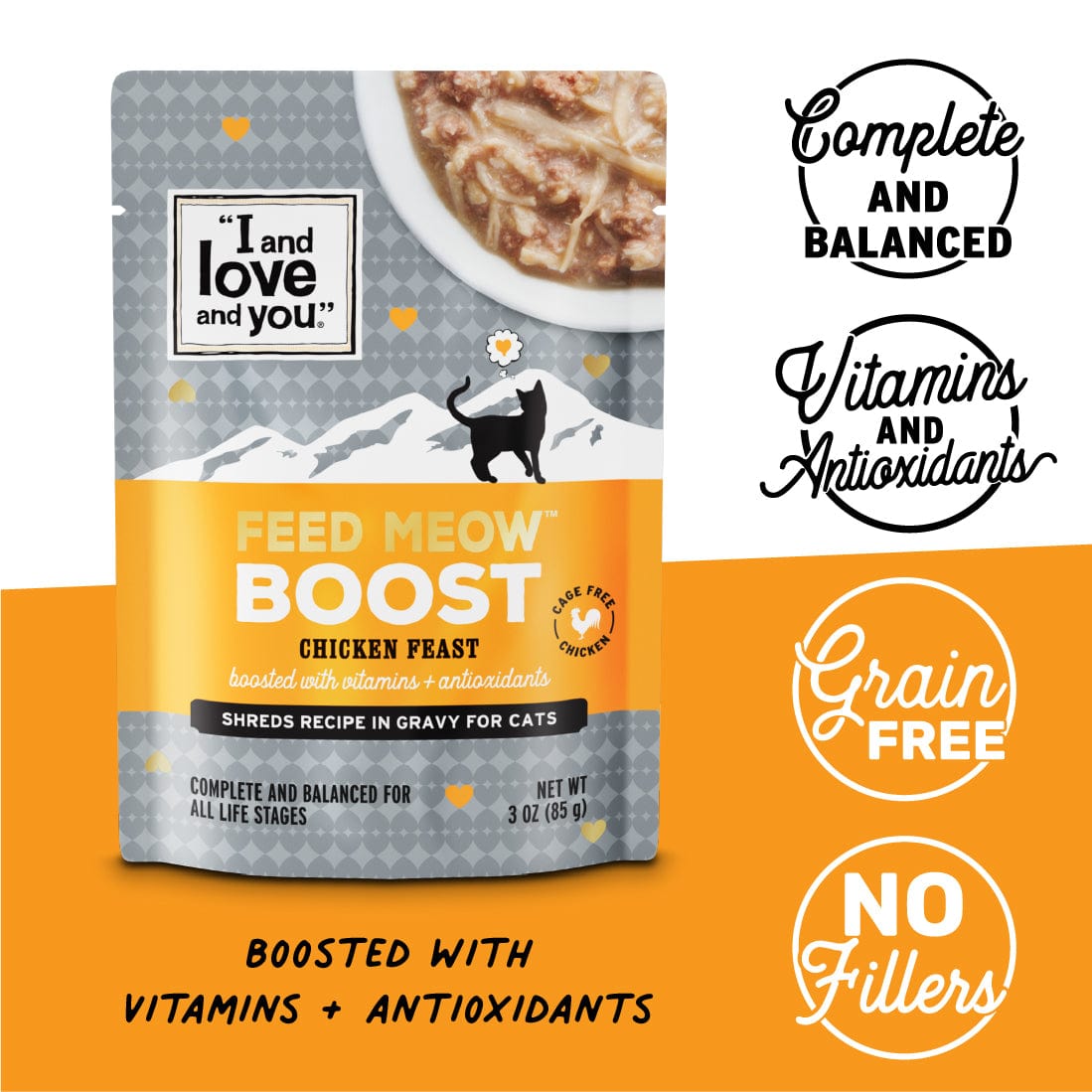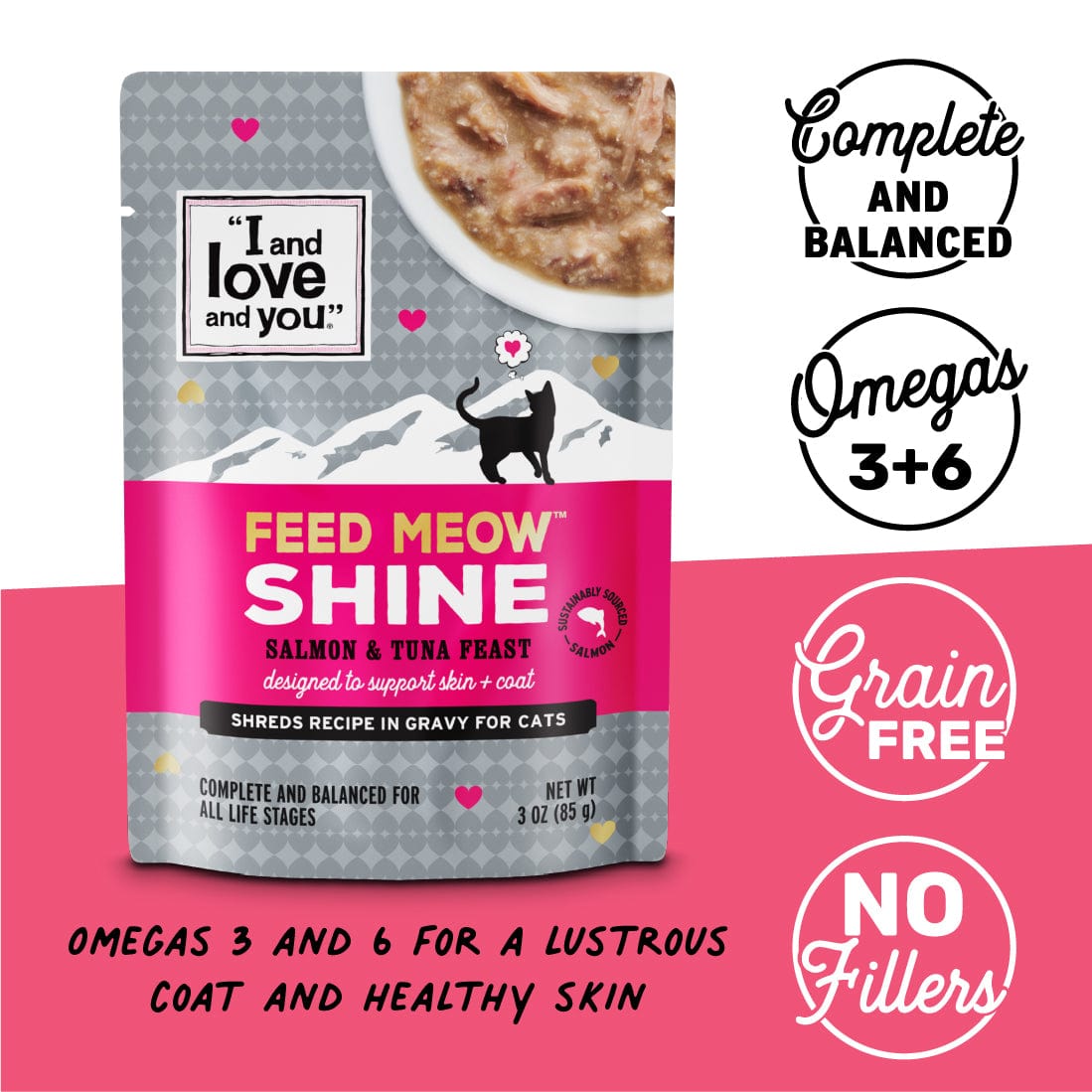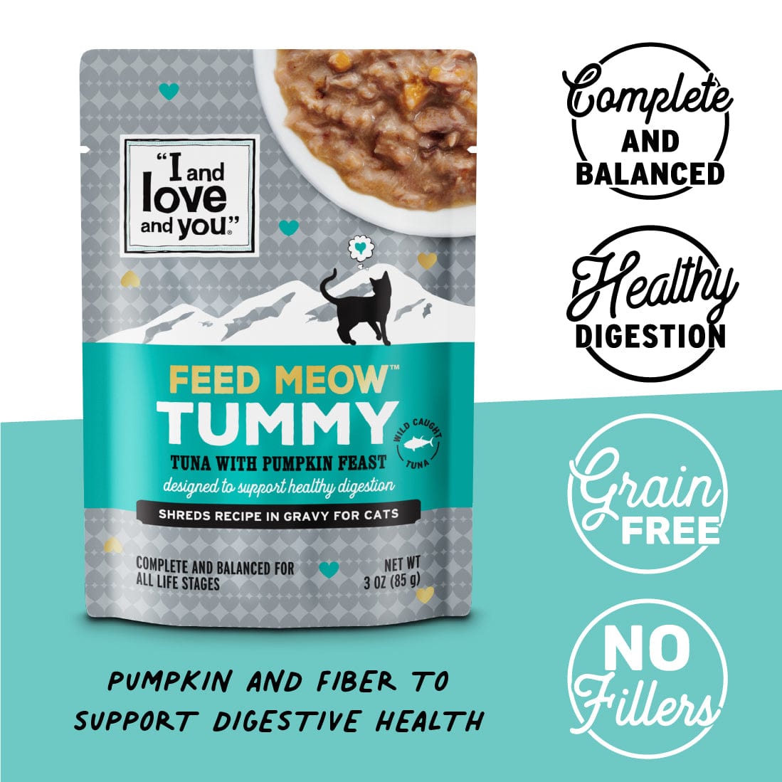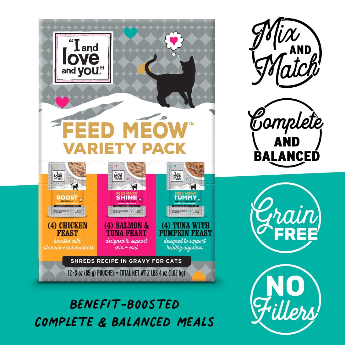Mix and match tasty, complete & balanced Feed Meow® meals to supercharge your pet’s diet, while keeping mealtime interesting with a variety of high-quality flavors! Each pouch is intentionally made with ingredients like pumpkin, Omega 3 & 6 fatty acids or prebiotics to help your cat maintain a healthy lifestyle.