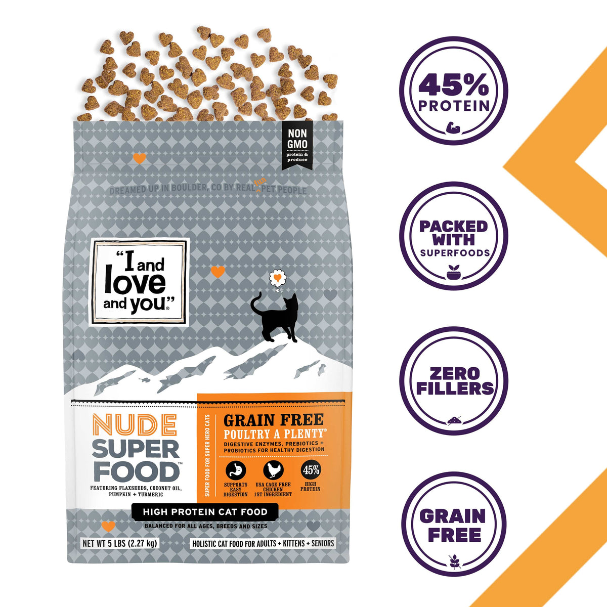 We’re of the mindset that less is more, and here’s why: we believe what’s NOT in your cat’s food is just as important as what’s in it. In this bag of kibble, your cat gets only the essentials: grain-free bites packed with real meat and prebiotics and probiotics. We left all the corn, wheat, soy, rice, and white potatoes. Boo-yah.